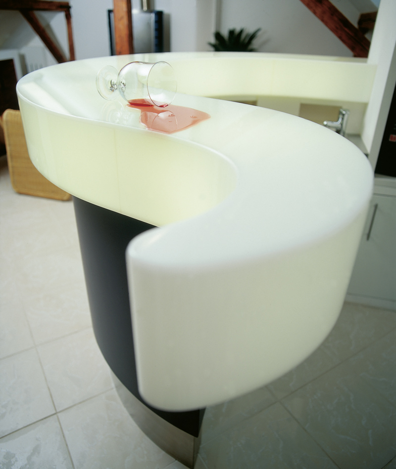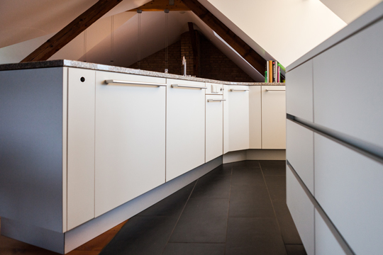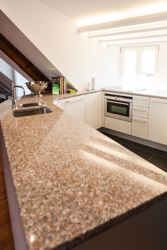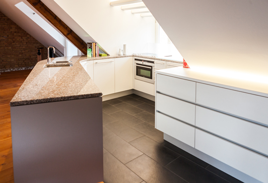 küche d Entwurf: Paul Harmuth Fronten: Schleiflack mit Griffmulden / Griffe Arbeitsplatte: Stein indirekte Beleuchtung zurück zur Übersicht